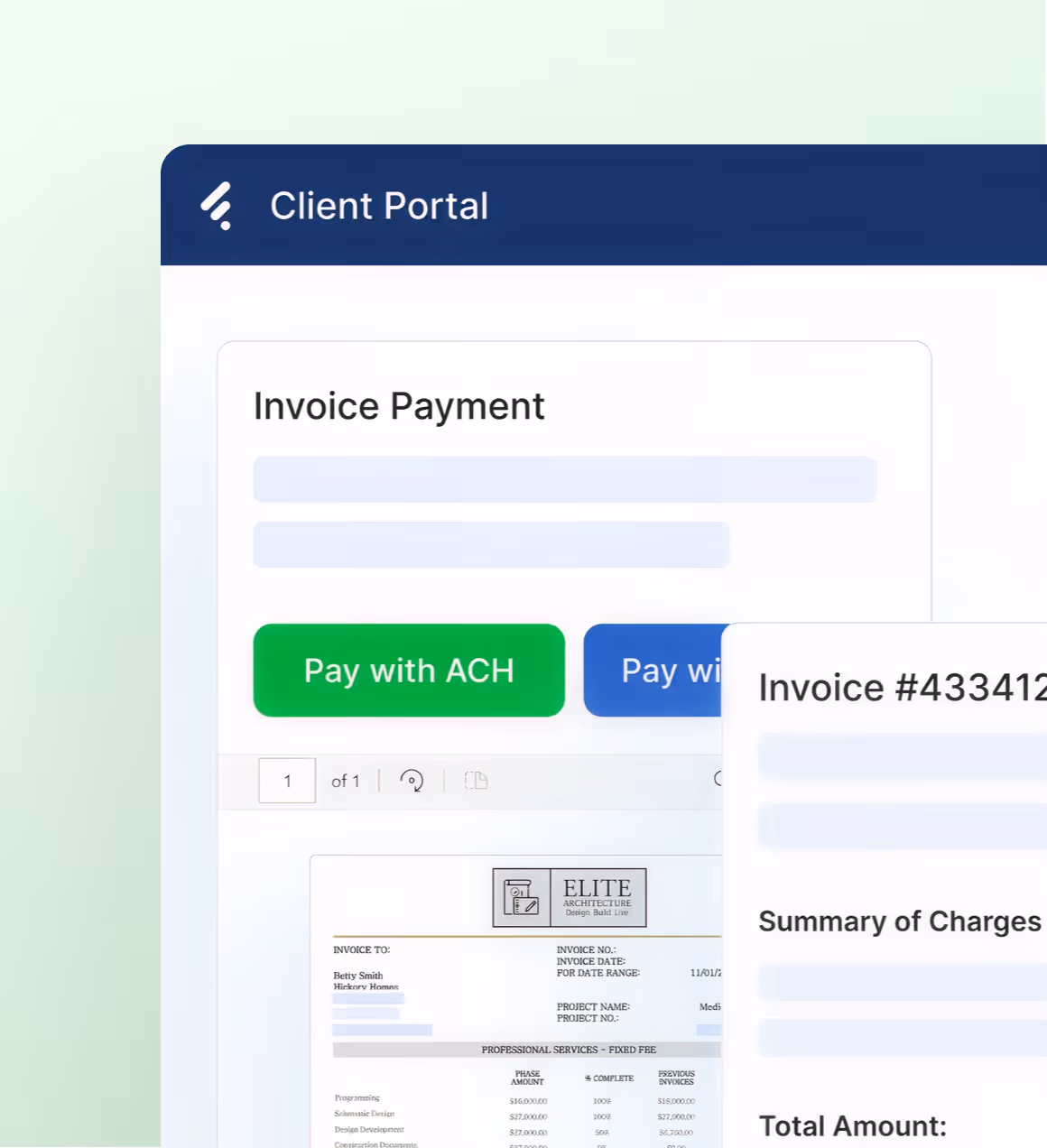 Make paying simple and AR current. Clients pay from the invoice, invoice and payment statuses update in QuickBooks Online in real time, and you see the impact on budgets, cash flow, and open balances.
