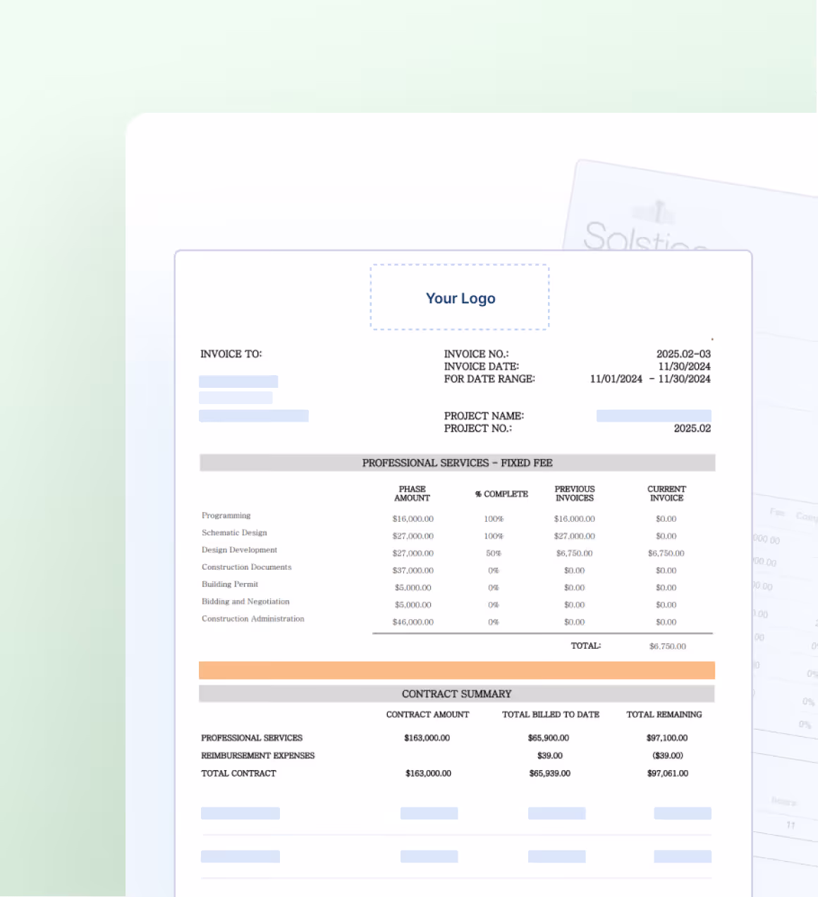Send invoices your way for fixed fee, hourly, or phased work. Customize client views, track progress and deposits, and keep billing simple, accurate, and flexible.