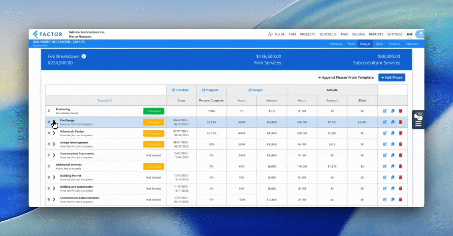 Set up phases the way your firm actually works. Add fees and subconsultants where they belong, and track fee types together or split by phase for clear reports and simple billing.