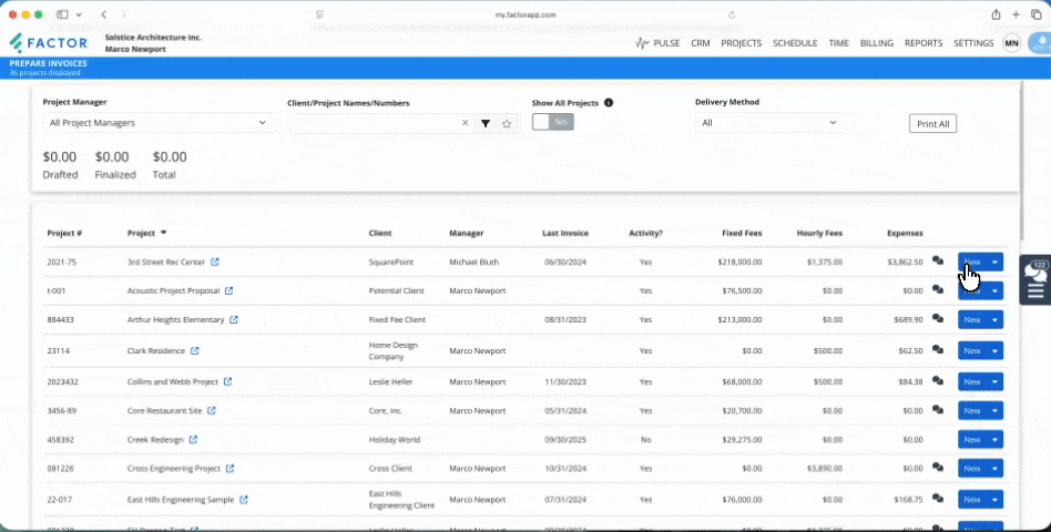 Bill from a single source of truth. Invoicing pulls live project data so what you bill always matches the work. See budgets, WIP, approved time, expenses, and subconsultant bills in one place, then review, approve, and send without ever switching tools.